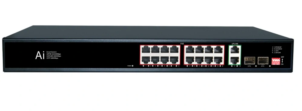 16-portový PoE Switch se 2 Gigabitovými RJ45 a 2 SFP Uplink Porty