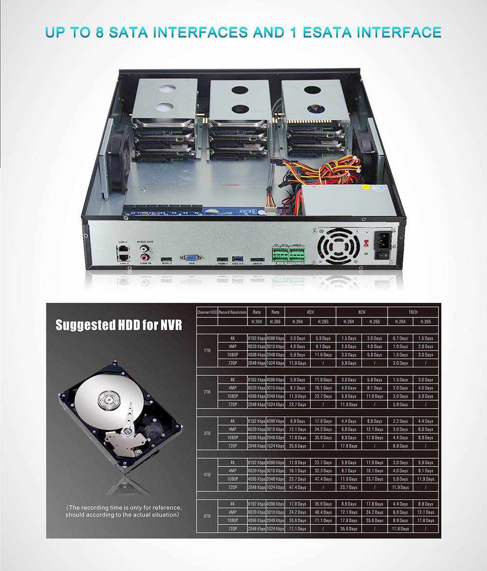 | Rekordní rychlost | PAL : 12MP@64chx25fps, 8MP@64chx25fps, 5MP@64ch × 25fps, 4MP@64ch25fps, 3MP@64ch × 25fps, 1080p@64ch × 25fps, 960p@64ch MP@ 64CHx30fps , 8MP @ 64CHx30fps , 5MP @ 64CH × 30fps, 4MP @ 64CH × 30fps, 3MP @ 64CH × 30fps, 1080P @ 64CH × 30fps, 960P @ 64CH × 7CH × 30fps @ 30fps , 40fps |