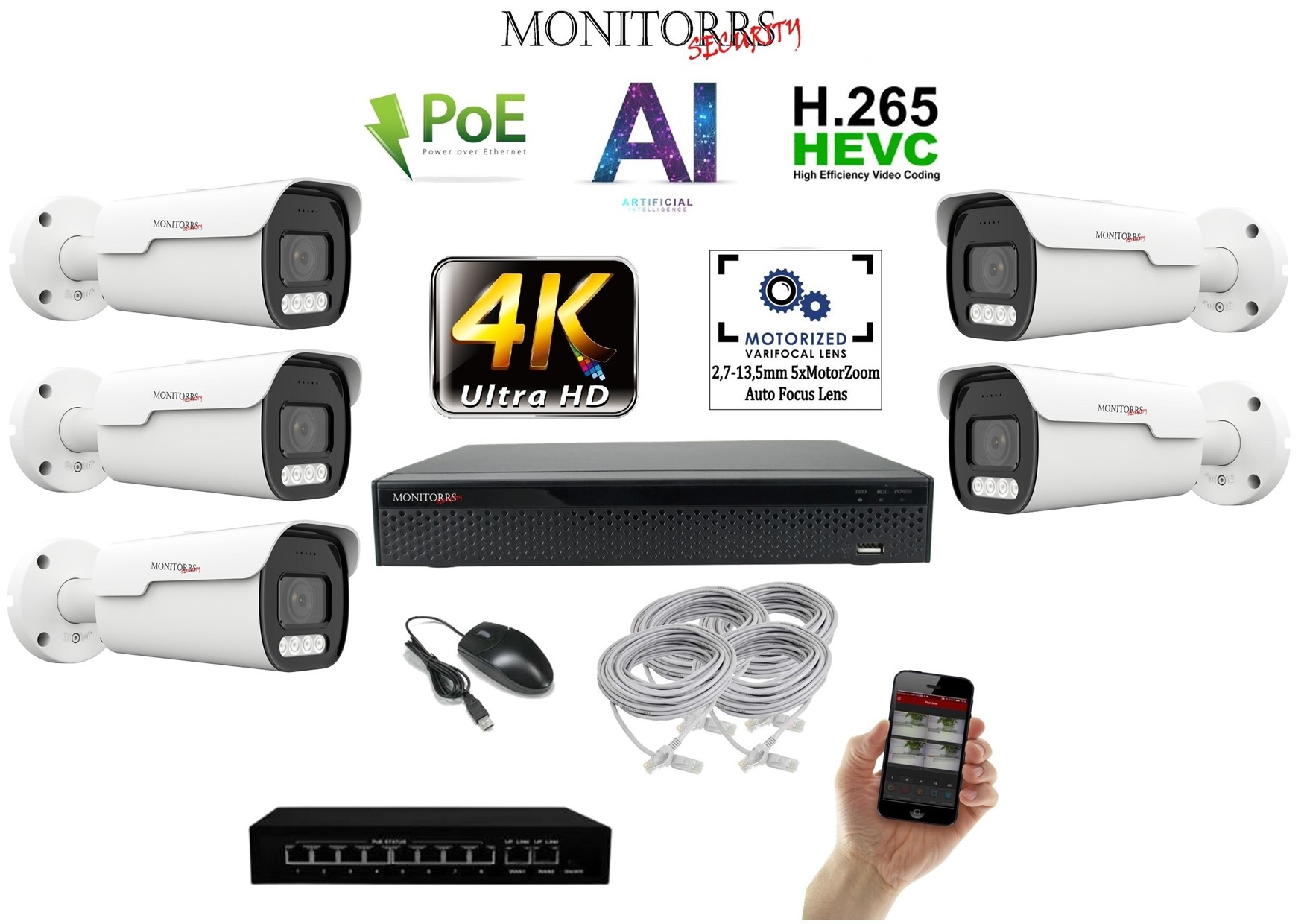 - MS 4k AI IP Park 5 kamerový set se switchem 8 Mpix (6380K5B)